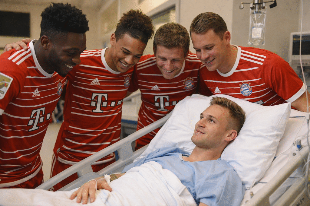 Besonders bewegend war die Reaktion innerhalb der Mannschaft. Mehrere Bayern-Spieler machten sich gemeinsam auf den Weg ins Krankenhaus, um ihren Teamkollegen zu besuchen und ihm persönlich Mut zuzusprechen. Szenen, die zeigten, wie stark der Zusammenhalt innerhalb des Kaders ist. Spieler wie Harry Kane, Thomas Müller und Leon Goretzka nahmen sich Zeit, um Kimmich beizustehen, Gespräche zu führen und für einen Moment den Fußball in den Hintergrund zu rücken.