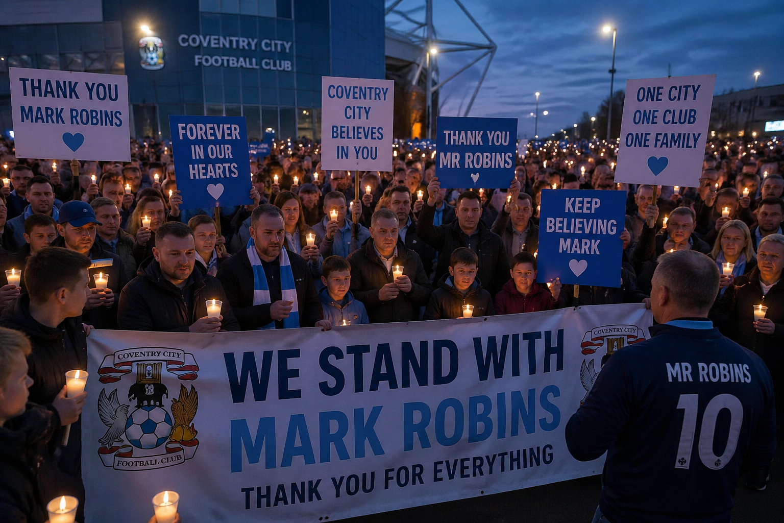 A wave of unity swept across Coventry as fans of Coventry City came together in an emotional tribute to their manager, Mark Robins. In a powerful display of loyalty and appreciation, supporters gathered with candles, heartfelt messages, and prayers, creating a moving atmosphere that reflected the deep bond between the club and its community.