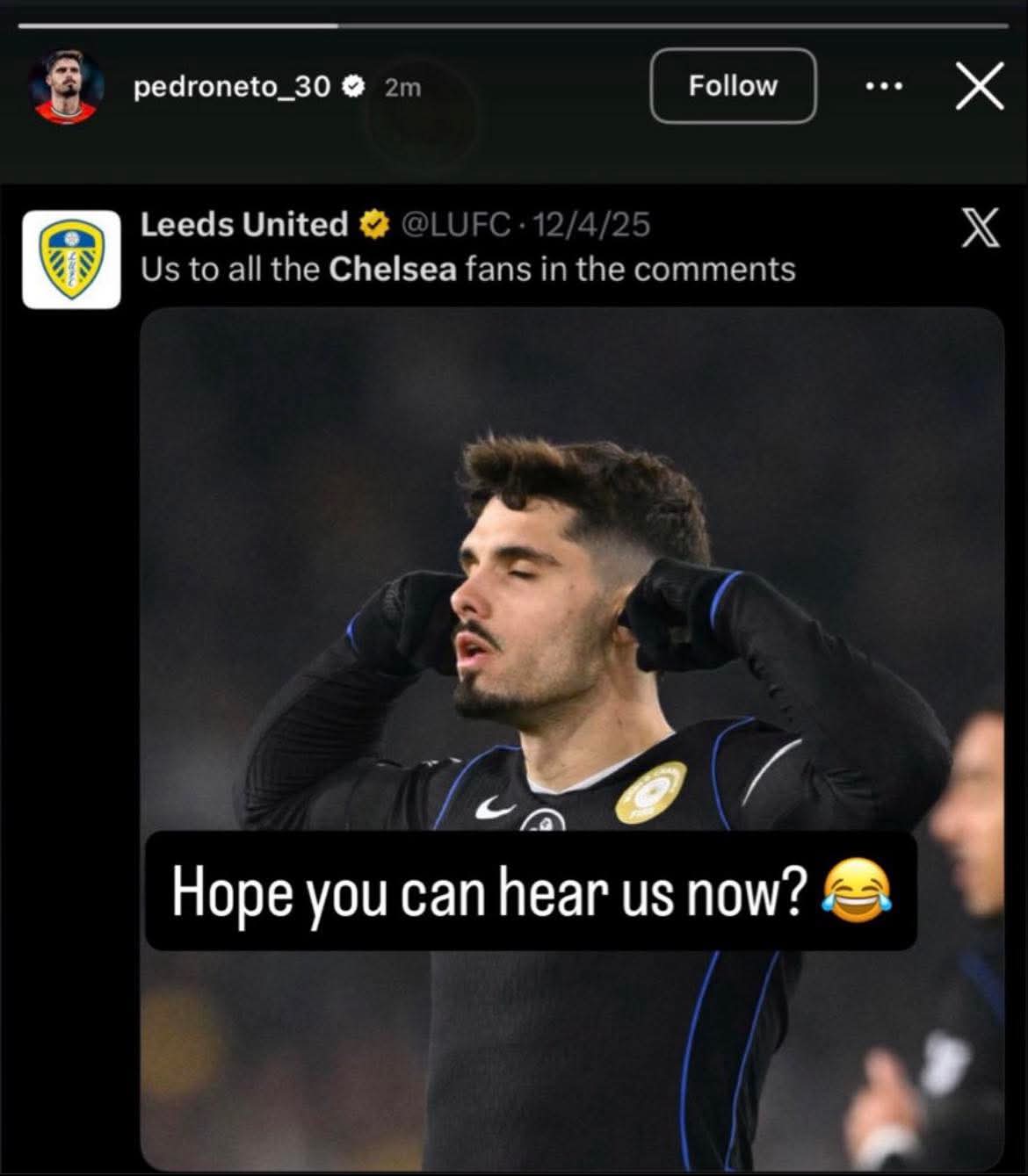 In a dramatic turn of events following Chelsea’s hard-fought victory, winger Pedro Neto has delivered a surprising message that has quickly captured the attention of football fans—especially those loyal to Leeds United. The Portuguese star, who played a pivotal role in Chelsea’s win, took to social media shortly after the final whistle to address Leeds supporters directly.